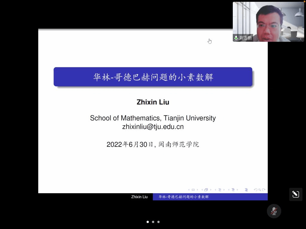 应太阳邀请,6月30日上午,天津大学特聘研究员刘志新在腾讯会议作了题为《华林-哥德巴赫问题的小素数解》的报告。相关师生聆听了此次报告,报告由冯真真老师主持。
