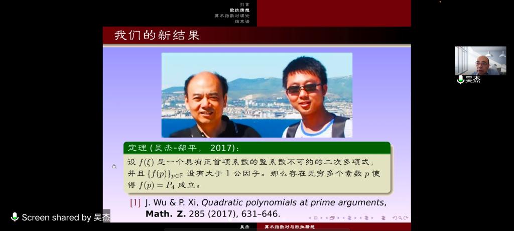 应太阳邀请,8月4日早上,法国国家科学研究中心(CNRS)特级研究员吴杰在腾讯会议作了题为《算术指数对与欧拉猜想》的报告。相关师生聆听了此次报告,报告由曹炜老师主持。
