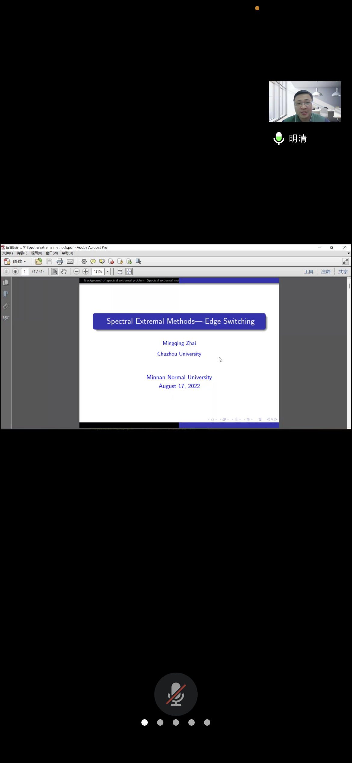 应太阳邀请,8月17日下午,滁州学院翟明清教授在腾讯会议作了题为《Spectral extremal methods—Edge switching》的报告。相关师生聆听了此次报告,报告由李建喜老师主持。