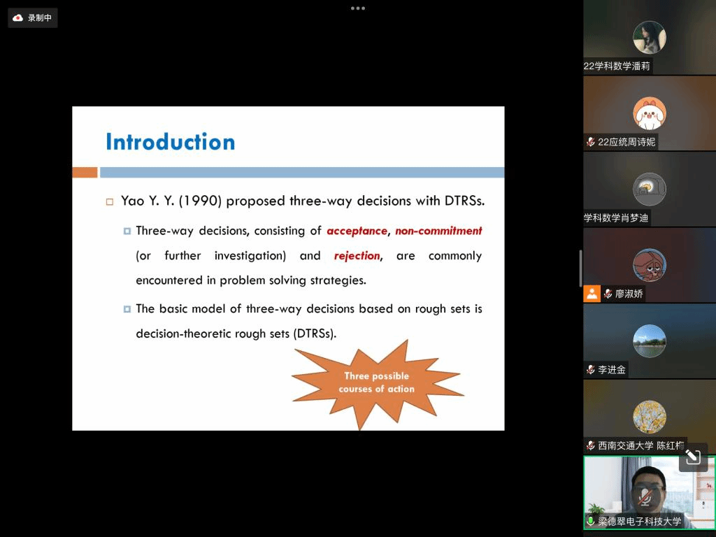 应太阳邀请,10月18日下午,电子科技大学梁德翠教授在腾讯会议作了题为《三支决策中的偏好学习与共识机制研究》的报告。相关师生聆听了此次报告,报告由廖淑娇老师主持。