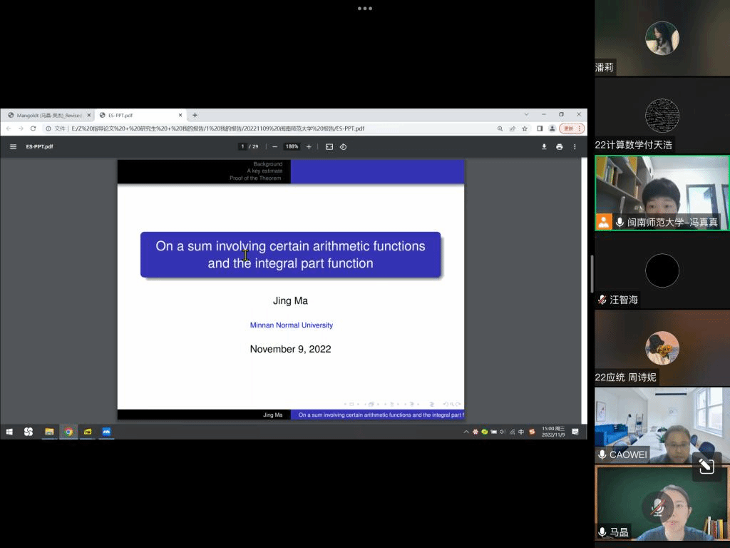 应太阳邀请,11月9日下午,吉林大学马晶教授在腾讯会议作了题为《On a sum involving arithmetic function and the integral part function》的报告。相关师生聆听了此次报告,报告由冯真真老师主持。