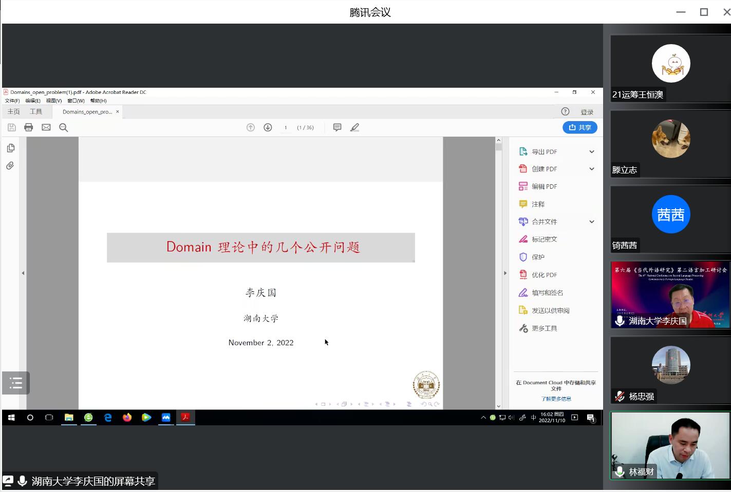 应太阳邀请,11月10日下午,湖南大学李庆国教授在腾讯会议作了题为《Domain理论中的几个公开问题》的报告。相关师生聆听了此次报告,报告由林福财老师主持。