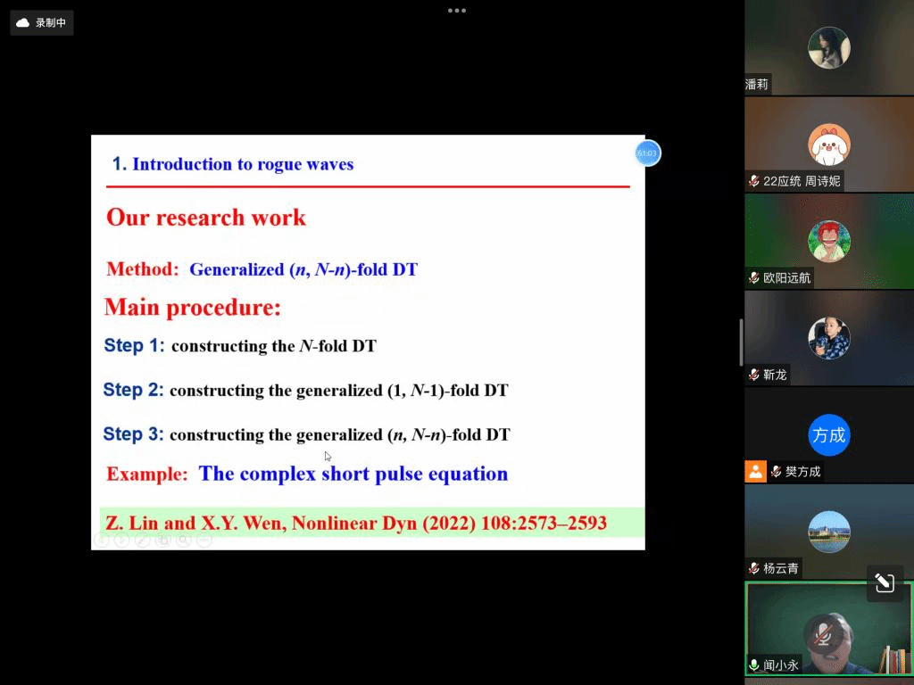 应太阳邀请,11月16日晚上,北京信息科技大学闻小永教授在腾讯会议作了题为《Position controllable loop localized wave solutions》的报告。相关师生聆听了此次报告,报告由樊方成老师主持。