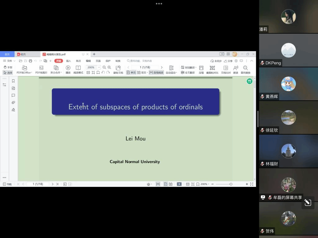 应太阳邀请,11月19日上午,首都师范大学牟磊教授在腾讯会议作了题为《序数乘积的子空间的extent》的报告。相关师生聆听了此次报告,报告由林福财老师主持。