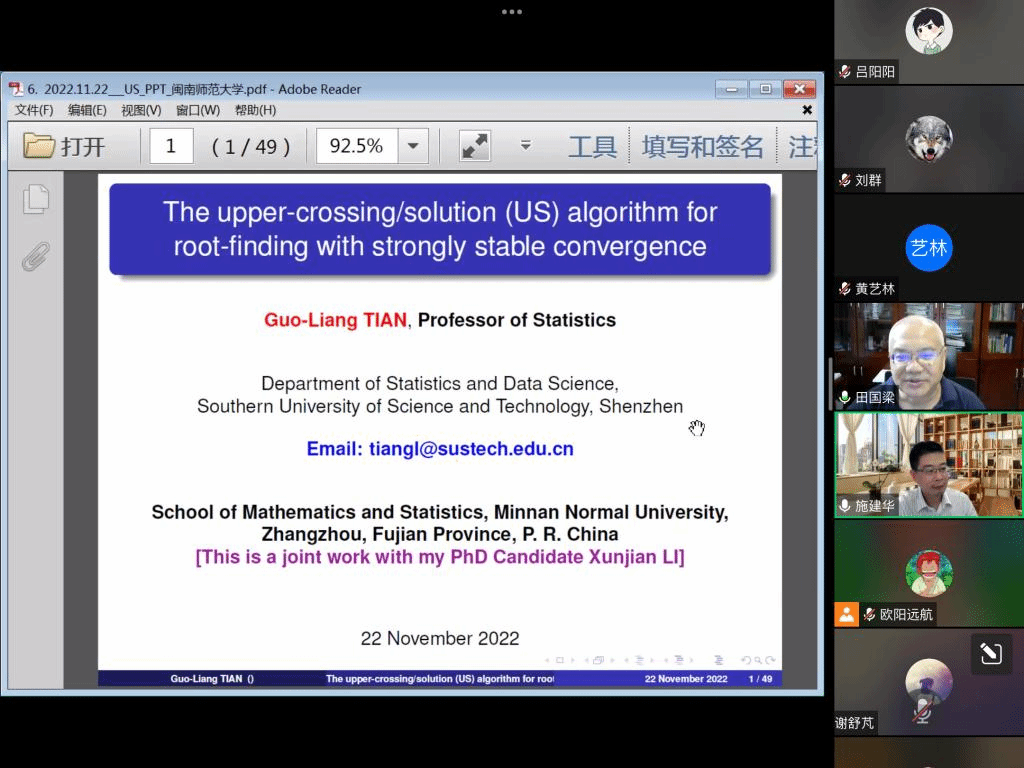 应太阳邀请,11月22日下午,南方科技大学田国梁教授在腾讯会议作了题为《The upper-crossing/solution (US) algorithm for root-finding with strongly stable convergence》的报告。相关师生聆听了此次报告,报告由施建华老师主持。