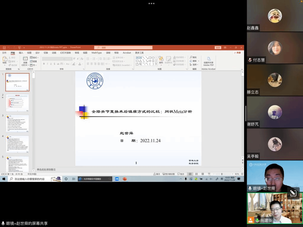 应太阳邀请,11月24日下午,吉林大学赵世舜教授在腾讯会议作了题为《A comparison of analgesic techniques for total knee arthroplasty: A network meta-analysis》的报告。相关师生聆听了此次报告,报告由施建华老师主持。