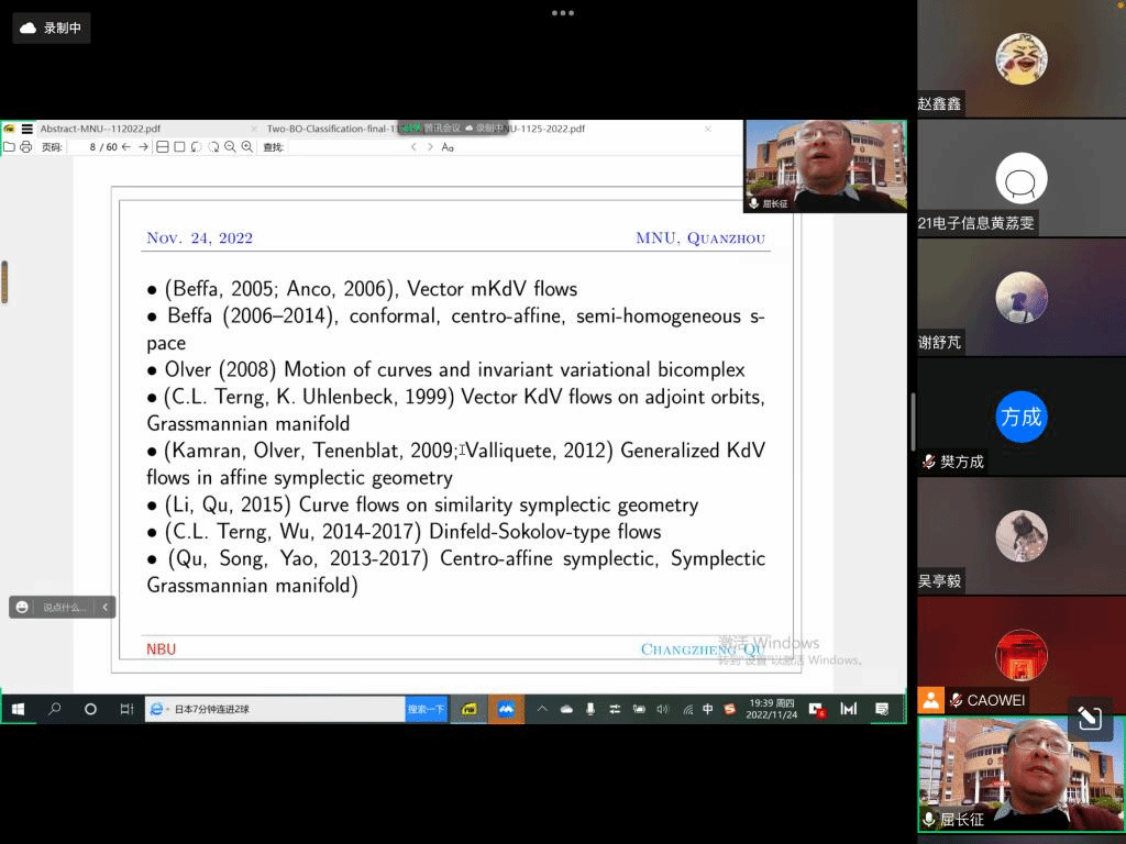 应太阳邀请,11月24日下午,宁波大学屈长征教授在腾讯会议作了题为《Geometric aspects of integrable systems》的报告。相关师生聆听了此次报告,报告由曹炜老师主持。
