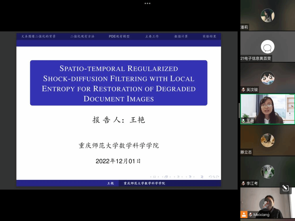 应太阳邀请,12月1日下午,重庆师范大学王艳教授在腾讯会议作了题为《Spatio-temporal regularized shock-diffusion filtering with local entropy for restoration of degraded document images》的报告。相关师生聆听了此次报告,报告由黄梅香老师主持。