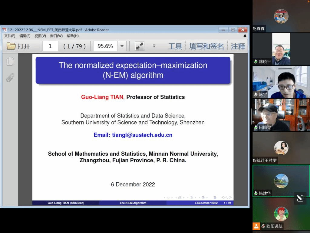 应太阳邀请,12月6日下午,南方科技大学田国梁教授在腾讯会议作了题为《The normalized expectation-maximization (N-EM) algorithm》的报告。相关师生聆听了此次报告,报告由陈宇老师主持。