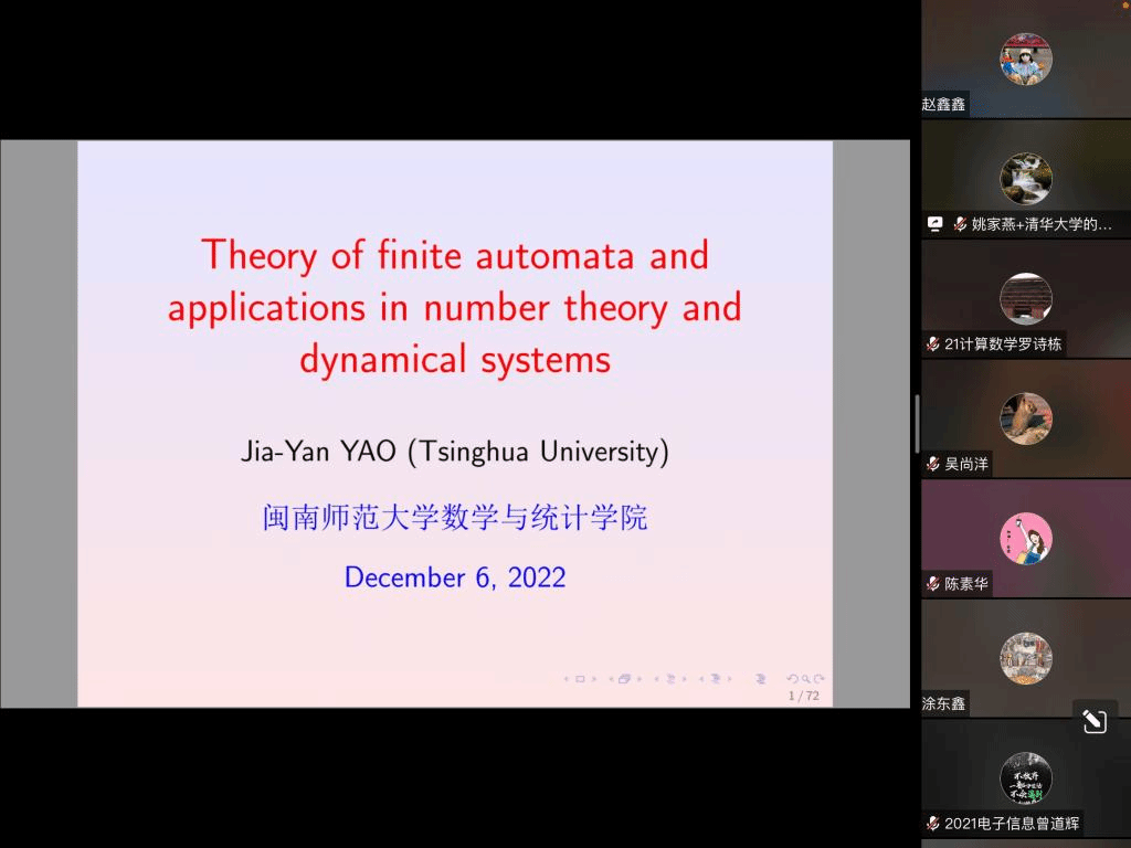 应太阳邀请,12月6日下午,清华大学姚家燕教授在腾讯会议作了题为《有限自动机理论及其在数论与动力系统中应用》的报告。相关师生聆听了此次报告,报告由曹炜老师主持。