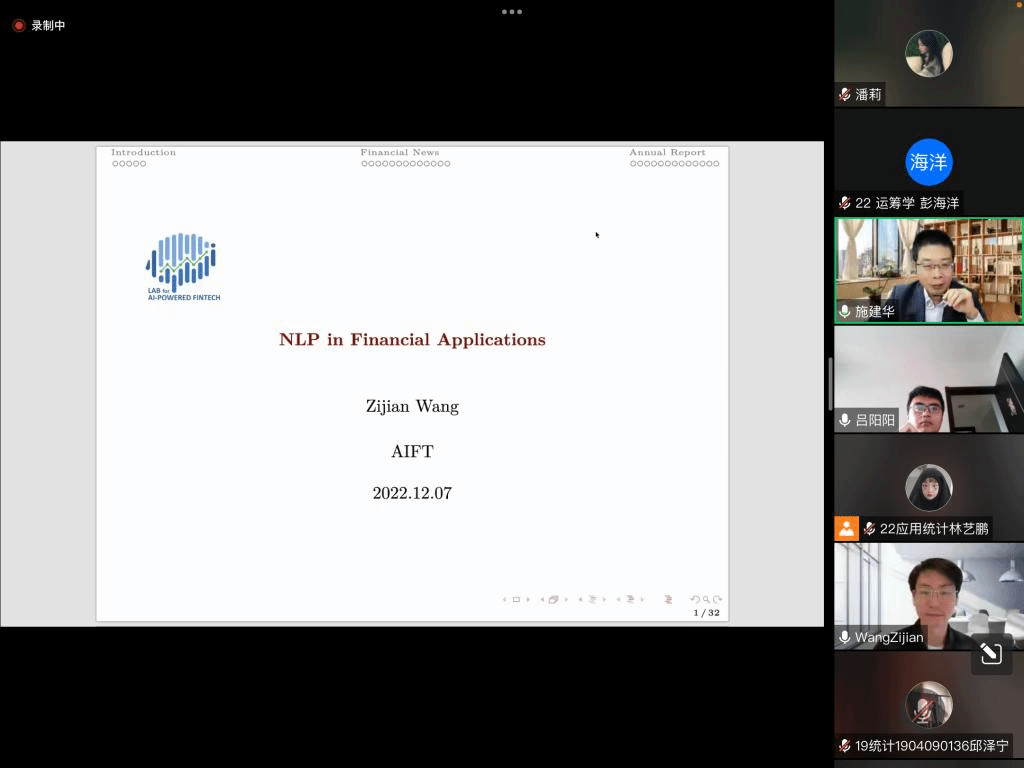 应太阳邀请,12月7日下午,香港人工智能金融科技实验室研究员王子剑在腾讯会议作了题为《自然语言处理在金融中的应用》的报告。相关师生聆听了此次报告,报告由施建华和吕阳阳老师主持。