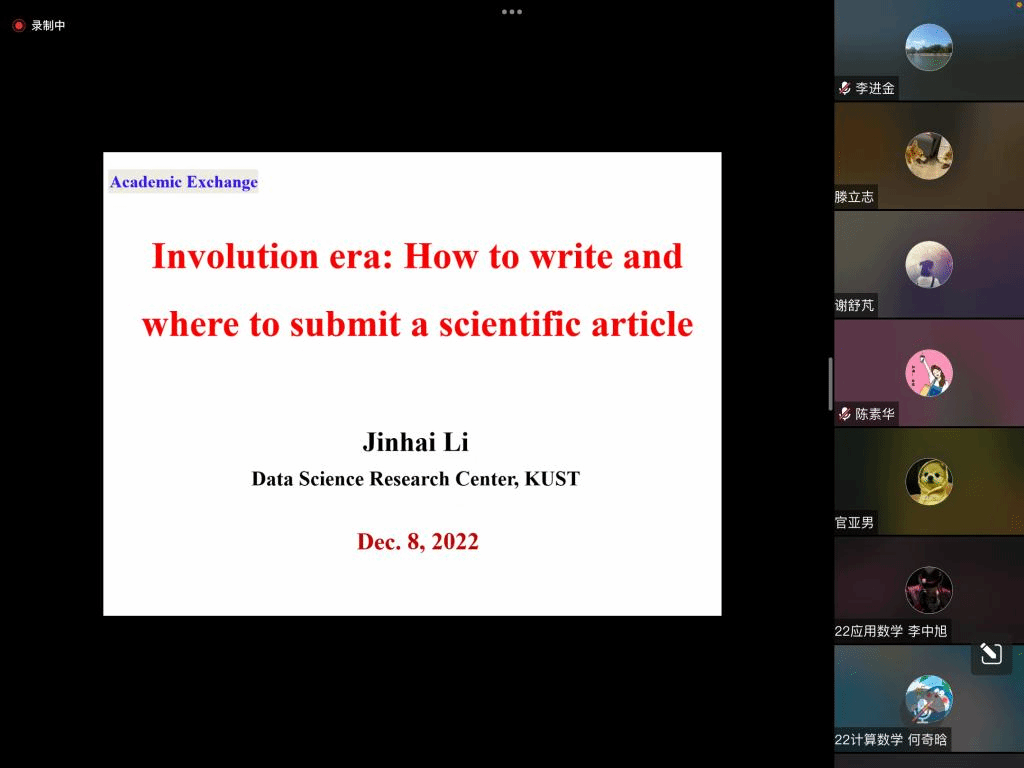 应太阳邀请,12月8日下午,昆明理工大学李金海教授在腾讯会议作了题为《科技论文写作与投稿》的报告。相关师生聆听了此次报告,报告由林艺东老师主持。