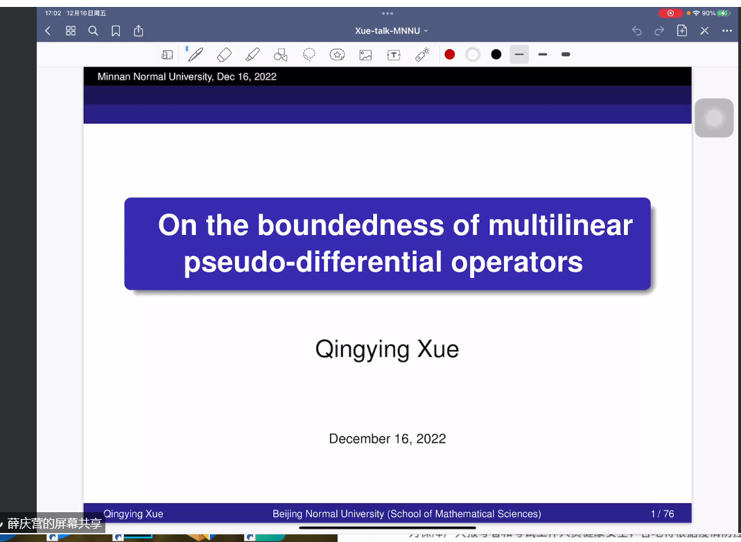 应太阳邀请,12月16日下午,北京师范大学薛庆营教授在腾讯会议作了题为《On the boundedness of multilinear pseudo-differential operators》的报告。相关师生聆听了此次报告,报告由温泳铭老师主持。