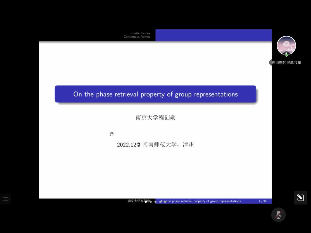 应太阳邀请,12月16日下午,南京大学程创勋教授腾讯会议作了题为《On the phase retrieval property of group representations》的报告。相关师生聆听了此次报告,报告由曹炜老师主持。