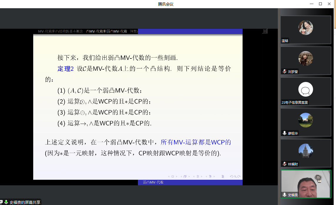 应太阳邀请,3月4日早上,北京理工大学史福贵教授在腾讯会议作了题为《弱凸MV-代数》的报告。相关师生聆听了此次报告,报告由林福财老师主持。