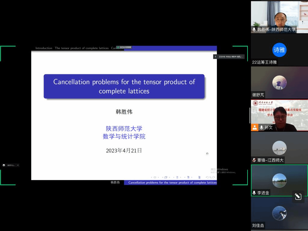 应太阳邀请,4月21日下午,陕西师范大学韩胜伟教授在腾讯会议作了题为《Cancellation problems for the tensor product of complete lattices》的报告。相关师生聆听了此次报告,报告由孙文老师主持。