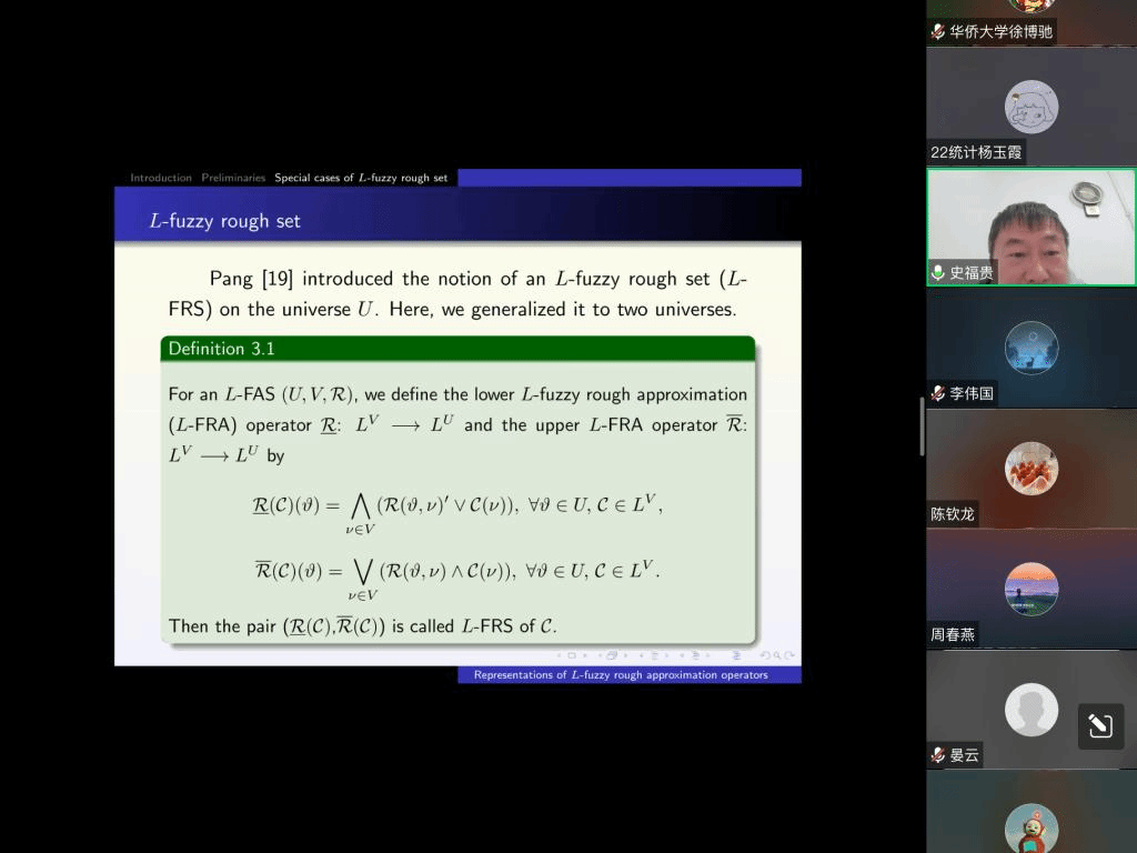 应太阳邀请,4月22日上午,北京理工大学史福贵教授在腾讯会议作了题为《Representations of L-fuzzy rough approximation operators》的报告。相关师生聆听了此次报告,报告由孙文老师主持。