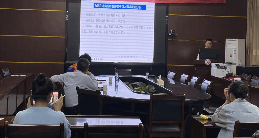 应太阳邀请,4月24日下午,河南理工大学智慧来副教授在砺志楼114作了题为《基于形式概念分析的冲突分析》的报告。相关师生聆听了此次报告,报告由孙文老师主持。